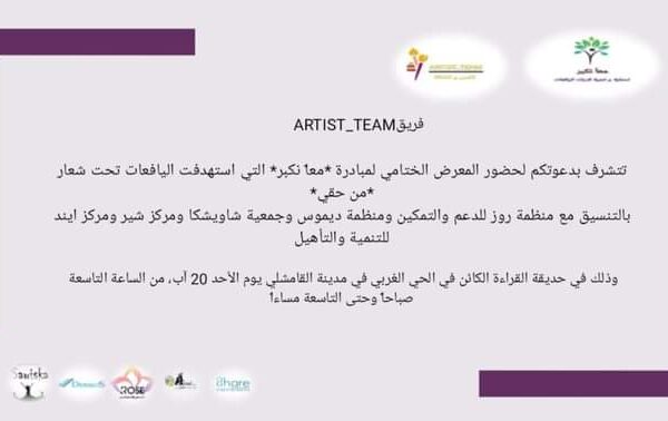 انطلاق حملتنا تحت اسم (انتِ الحب انتِ الامان)Adminمايو 4, 2024بمناسبة الشهر الوردي شهر اكتوبر يعلن فريق Artist_Team للفنون و الثقافة و بدعم من منظمة نيكستيب – Nextep Organization Share ... اقرأ أكثر