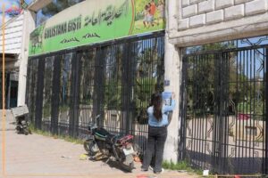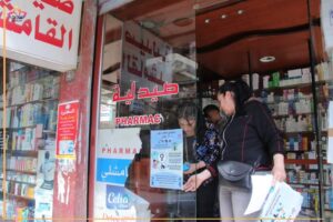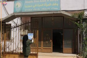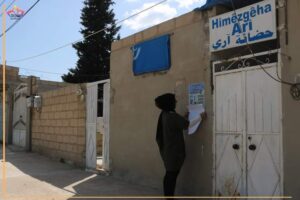 أعضاء حملة «رعايتي مطلب حق»، أثناء توزيع ولصق بوستر توعوي عن تأمين الرعاية الصحية والبيئة الآمنة للمرأة في العمل، في مدينة قامشلي.